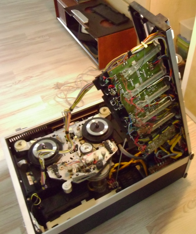 Als erstes wurde die Maschine geöffnet. Ein großes Lob an Philips, das ist echt super gelöst worden. Man löst 7 Schrauben an der Front, nimmt die Abdeckung des Laufwerks ab, und kann die Steuereinheit wie eine Motorhaube aufklappen. Hier noch 2 Bilder wie das dann aussieht: